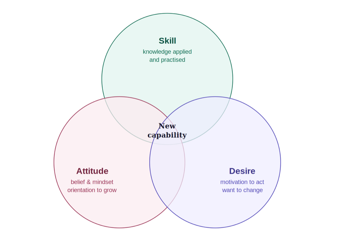 Skill is the practical capacity to do the thing. Here precision matters: knowledge - knowing what good management looks like - is not the same as skill. Knowledge is the raw material. Skill is what knowledge becomes when it has been applied in real conditions, reflected on honestly, and practised again. Most training develops knowledge. Very little creates the conditions for knowledge to become skill.