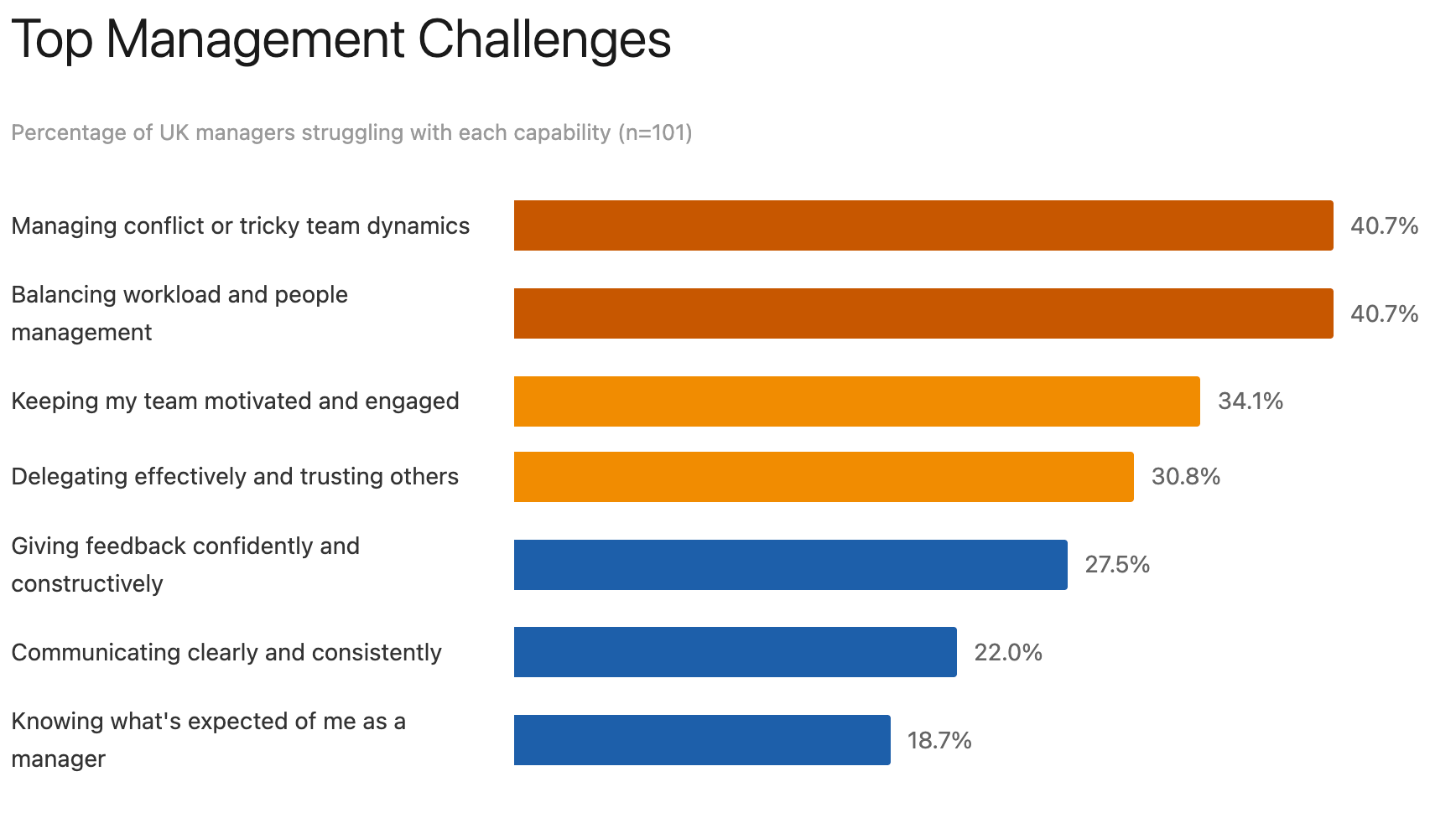 Our survey of 101 managers confirms what decades of research has shown: the transition from technical expert to people leader requires deliberate development, not accidental promotion. The challenges managers face - conflict, workload, motivation, delegation, feedback, communication, role clarity - aren’t mysteries. They're well-documented, well-researched, and most importantly, solvable.